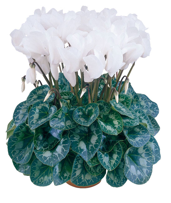 大輪の花弁を持つ単色シクラメン。